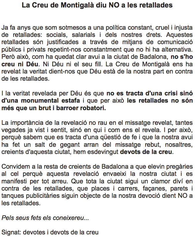 Desde su cuenta Twitter los @devotsBDN han reivindicado esta acción mediante un manifiesto y el vídeo: "El miracle de la creu"