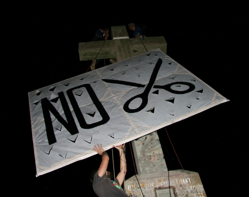 Ocupan la cruz de Montigalà en su centenario, cubriéndola con una gran pancarta contra los recortes sociales.